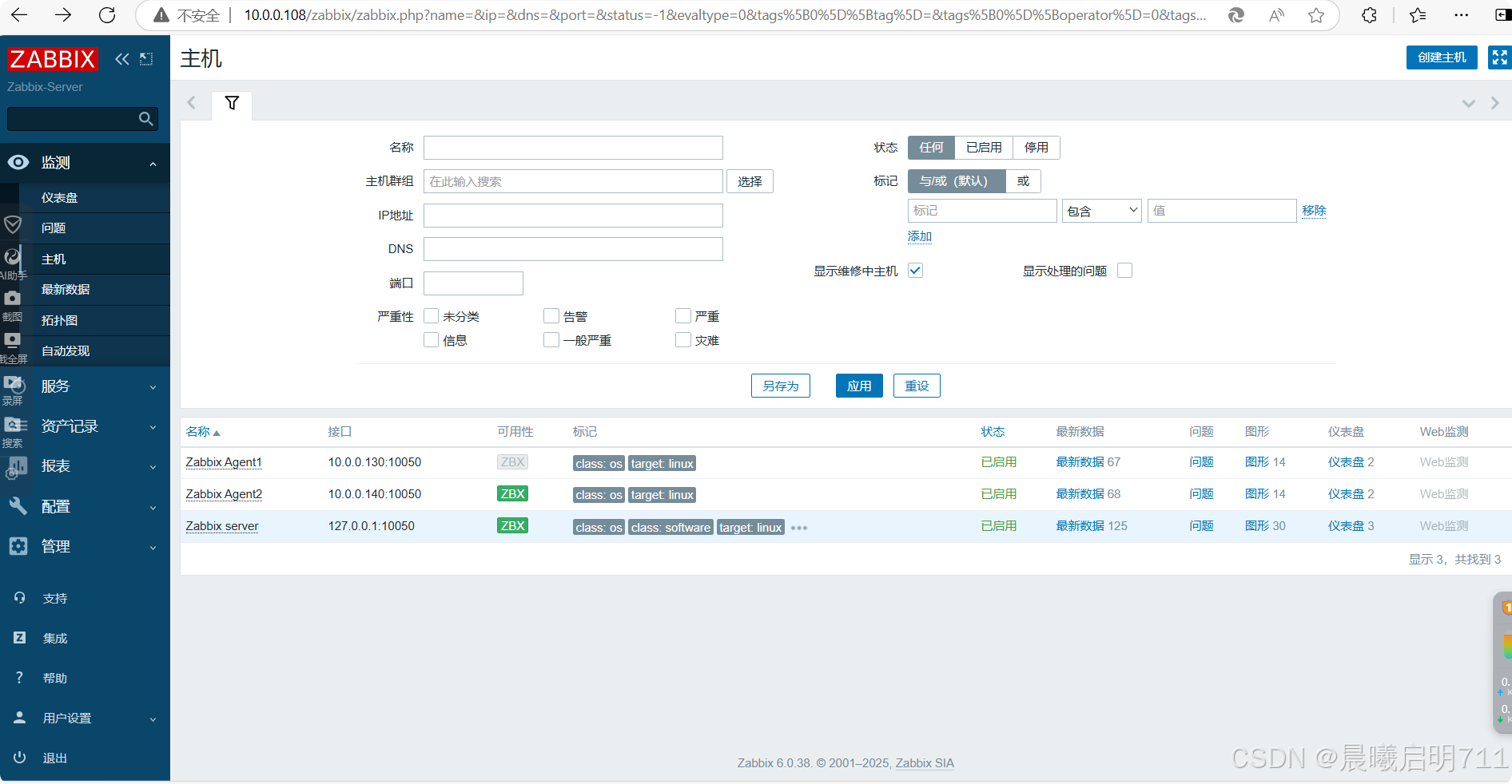 添加监控项和触发器:根据需要添加监控项、触发器和动作等。