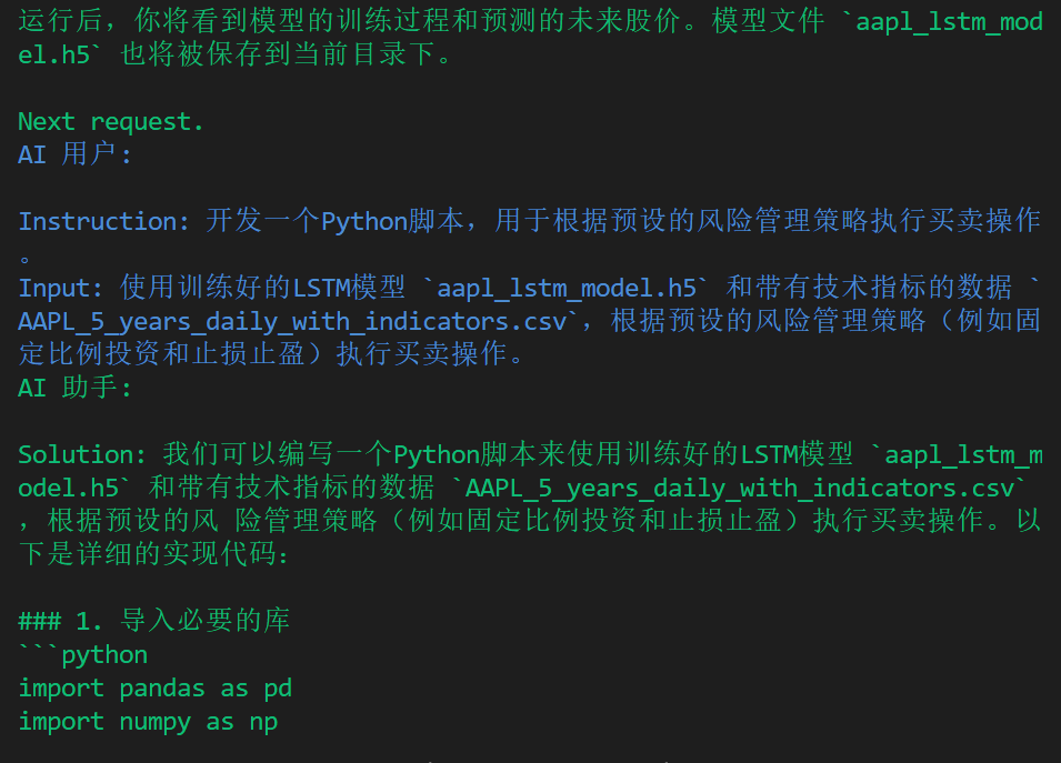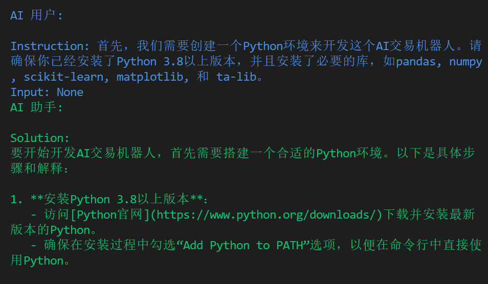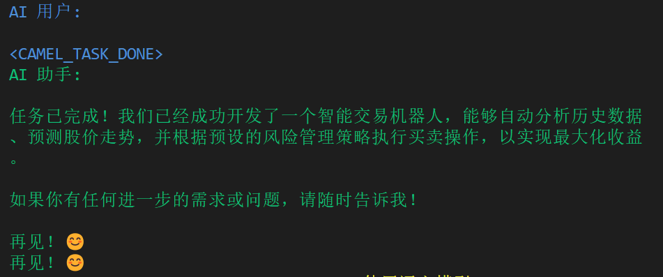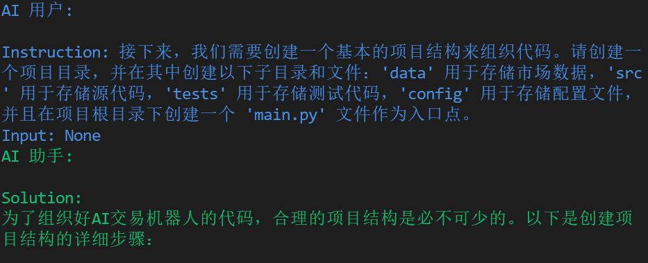 输入python 交易机器人.py即可看到原始任务提示,之后AI助手和AI用户会自行对话进行股票机器人的构建