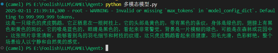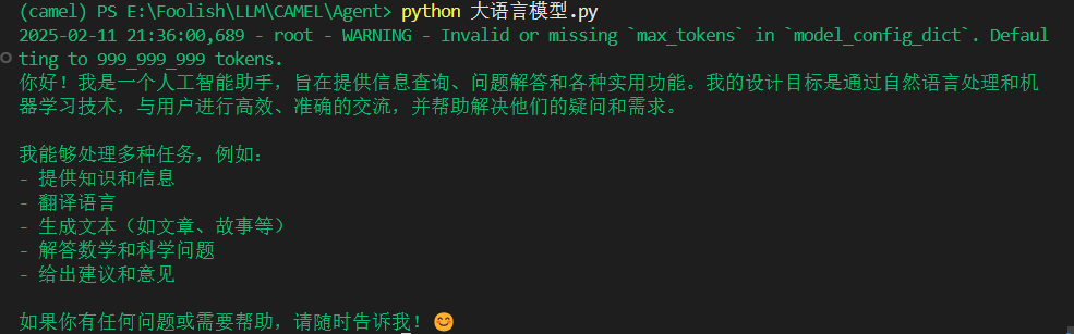 在你习惯的代码编辑器中新建一个大语言模型.py文件,通过调用CAMEL框架和刚刚的API密钥来进行对话,测试是否成功。