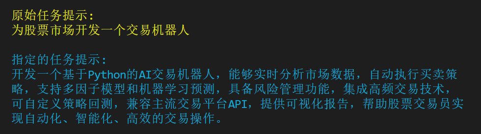 task_prompt = "为股票市场开发一个交易机器人"#设置任务目标
