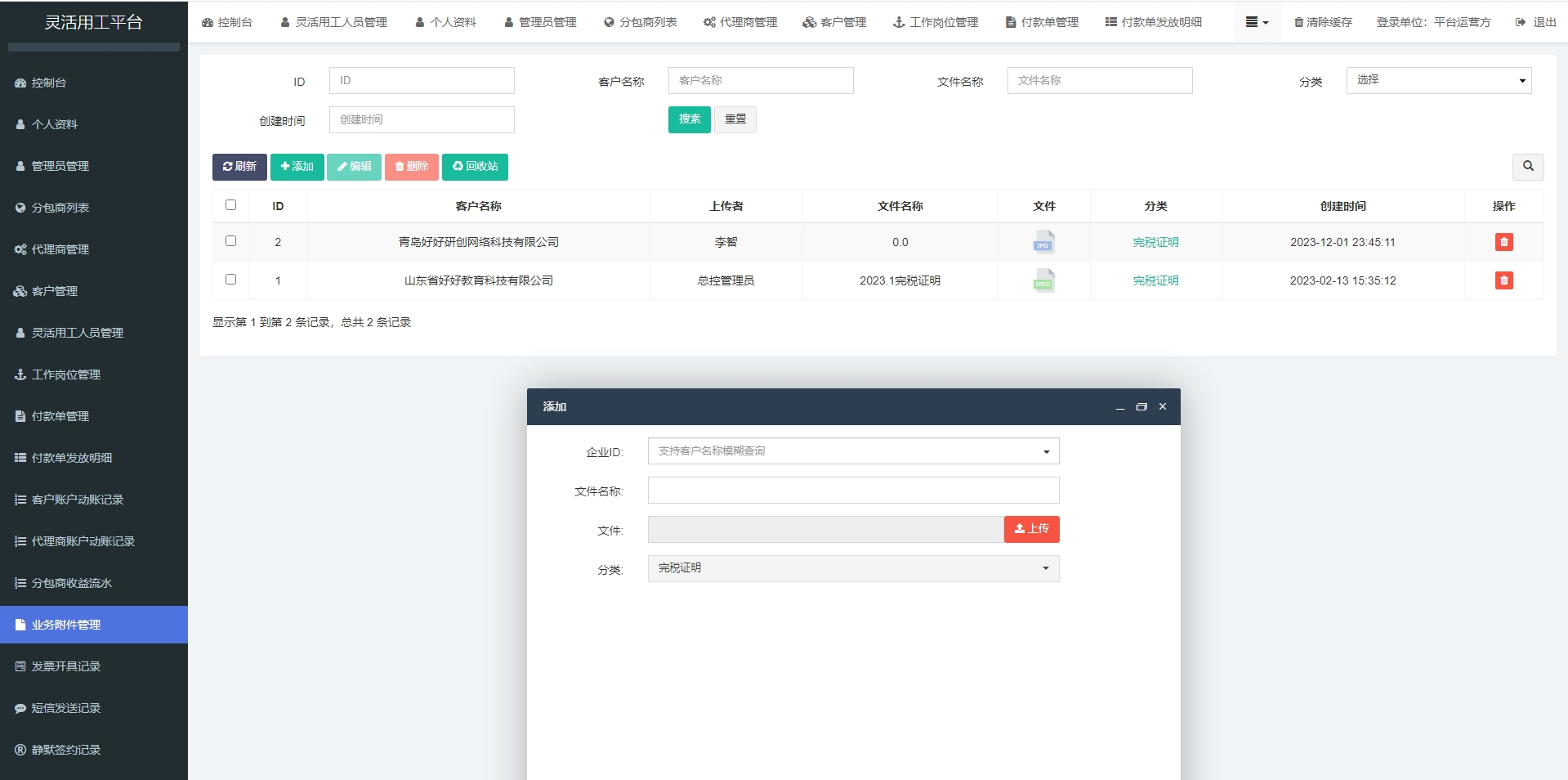 管理员:平台共有三种角色——平台管理员(灵工平台实际运营方)、代理商管理员(代 理推广方)、客户管理员(发放劳动报酬方)