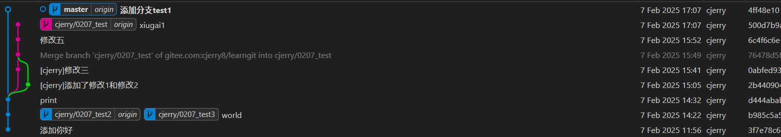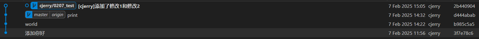 右键某一个版本,然后点击checkout,然后再命令行输入上面的指令即可:git checkout -b cjerry/0207_test2,这样就成功在world版本上创建了test2分支,可以发现1.txt的内容也只到world,没有修改一和修改二