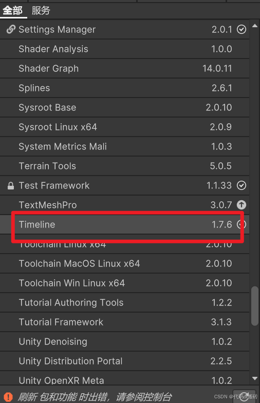 如果没有Timeline和Cinemachine切换到【Unity注册表】中,下面查找Timeline和Cinemachine,并且安装。