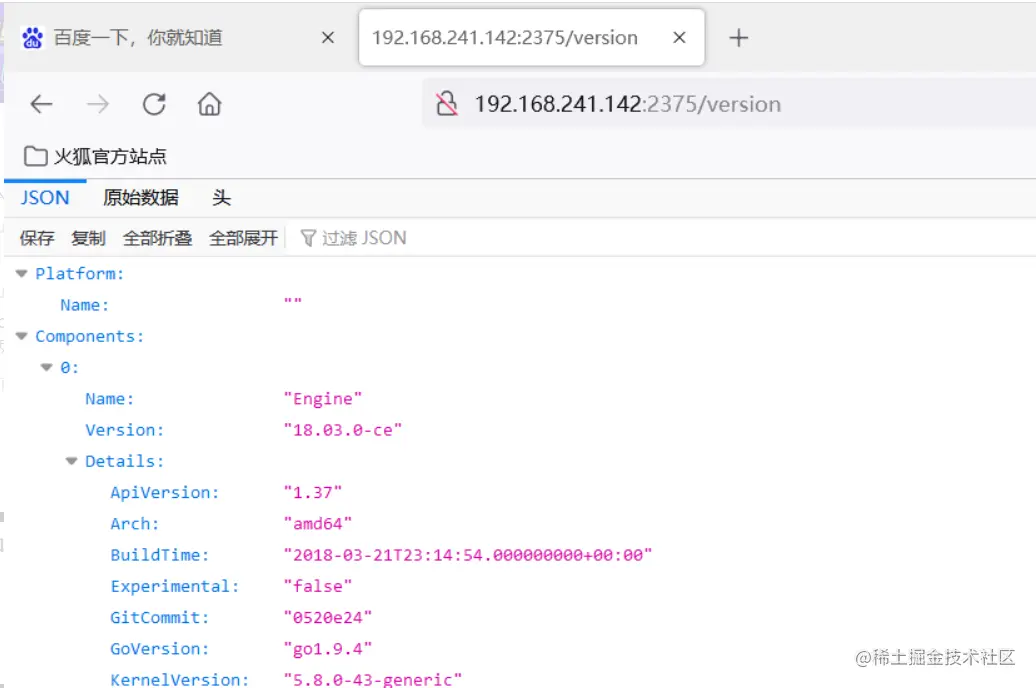 直接输入地址 http://your-ip: 2375/version ;若能访问,证明存在未授权访问漏洞。