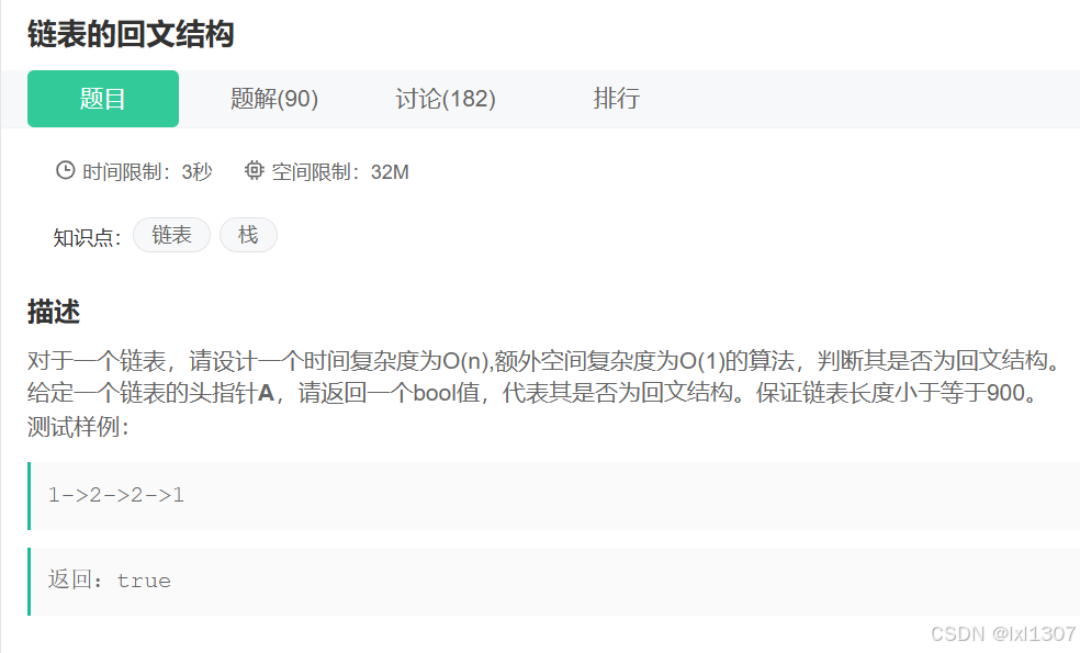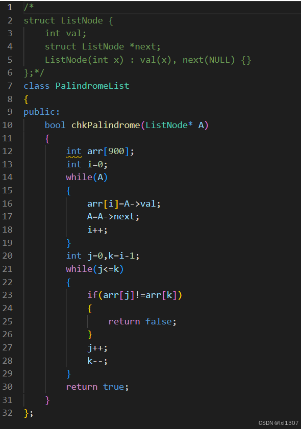 解法一:(投机取巧的办法)由于题目中保证链表长度小于等于900,所以可以创建一个长度为900的数组,通过遍历将链表中的数据依次储存到数组中,再在左下标小于等于右下标的情况下,从数组两端同时遍历,若数组元素不相等,返回false,否则返回true