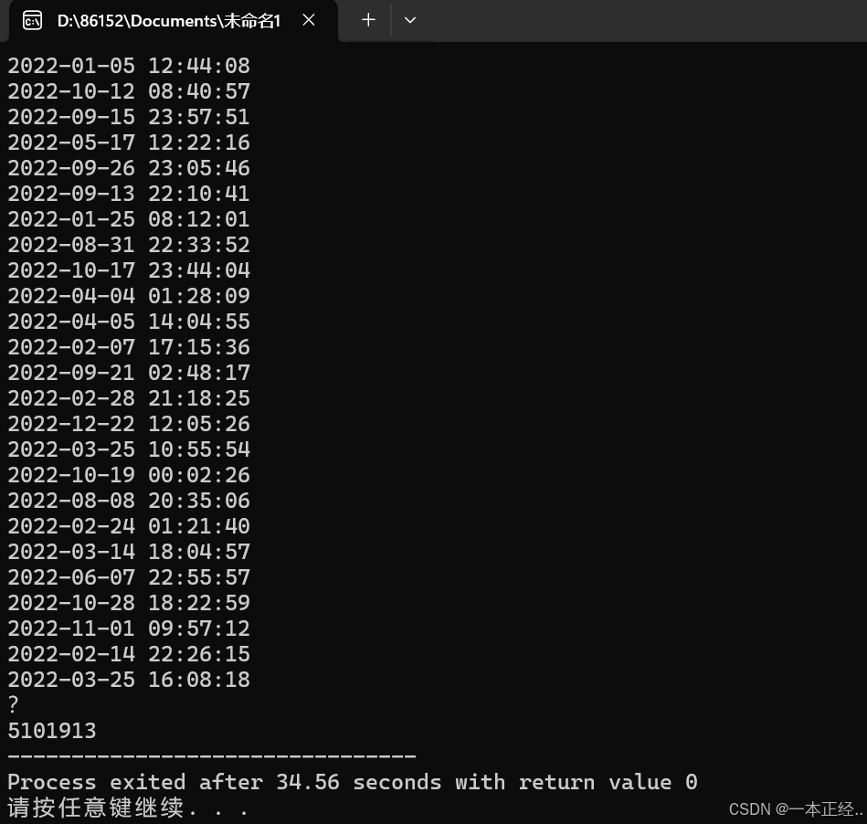 小蓝手里有一份 20222022 年度自己的上班打卡记录文件,文件包含若干条打卡记录,每条记录的格式均为“yyyy-MM-dd HH:mm:ssyyyy-MM-dd HH:mm:ss”,即按照年-月-日 时:分:秒的形式记录着一个时间点(采用 2424 小时进制)。由于某些原因,这份文件中的时间记录并不是按照打卡的时间顺序记录的,而是被打乱了。但我们保证小蓝每次上班和下班时都会正常打卡,而且正好打卡一次,其它时候不会打卡。每一对相邻的上-下班打卡之间的时间就是小蓝本次的工作时长,例如文件内容如下的话: