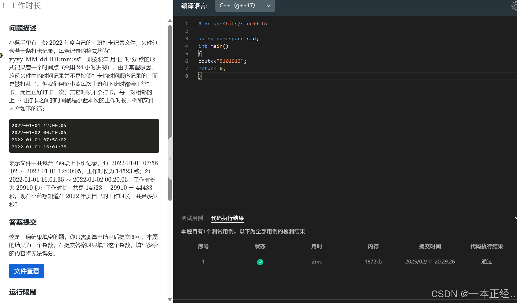 表示文件中共包含了两段上下班记录,1)20222022-0101-0101 0707:5858:02∼202202∼2022-0101-0101 1212:0000:0505,工作时长为 1452314523 秒;2)20222022-0101-0101 1616:0101:35∼202235∼2022-0101-0202 0000:2020:0505,工作时长为 2991029910 秒;工作时长一共是 14523+29910=4443314523+29910=44433 秒。现在小蓝想知道在 20222022 年度自己的工作时长一共是多少秒?