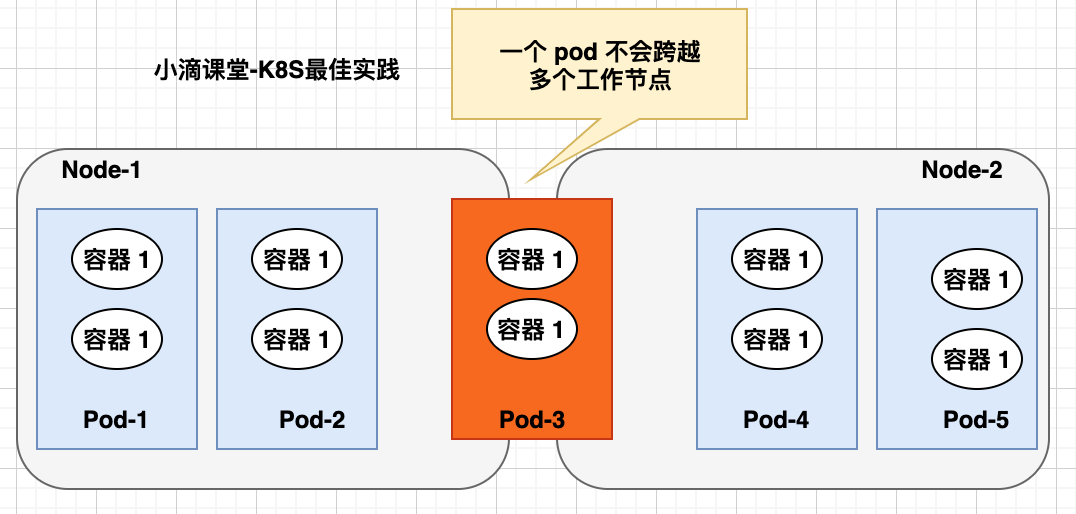 - 一个 pod 包含一组容器,一个 pod 不会跨越多个工作节点(不会跨机器)