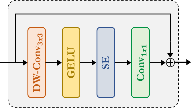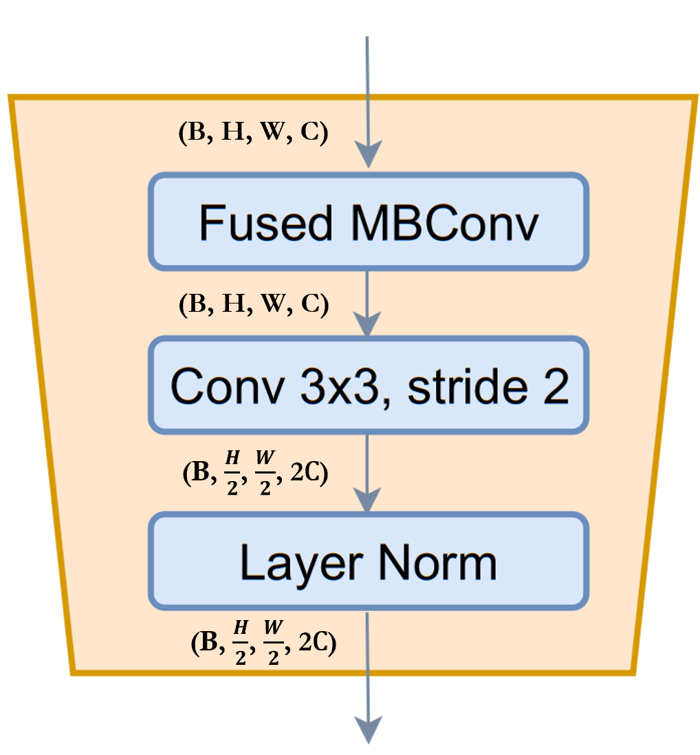 Fused-MBConv:这类似于 EfficientNetV2 中使用的那个。它使用 Depthwise-Conv、GELU、SqueezeAndExcitation、Conv 来提取特征 A 住宅 连接。请注意,没有为这个模块声明新模块,我们只是简单地应用 对应的模块。