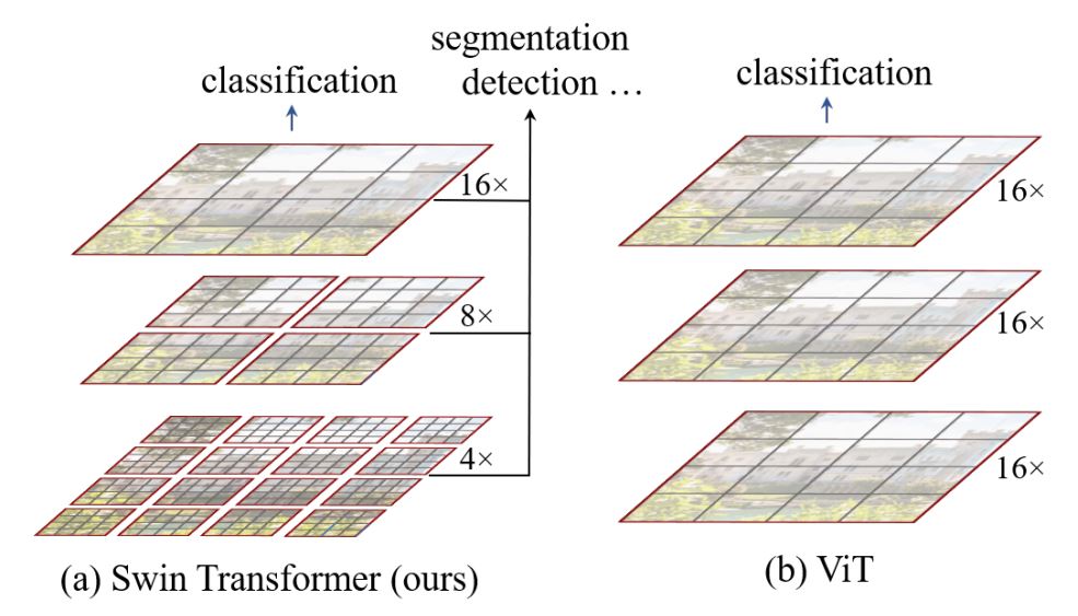 O(n^2)]计算复杂度 的多尺度信息使得 ViT 很难被视为 适用于 Compute Vision 任务(如分段和对象)的通用架构 检测,其中需要在像素级别进行密集预测。 - Swin Transformer 试图通过提出多分辨率 / 分层架构来解决 ViT 的问题,其中计算了自我注意力 在本地窗口和跨窗口连接中,例如使用 Window Shifting 用于对不同区域的交互进行建模。但有限的感受野 的本地窗口无法捕获远距离信息,且跨窗口连接 窗户移动等计划仅涵盖 每个窗口。此外,它缺乏鼓励某些翻译的归纳偏差 不变性对于通用视觉建模仍然更可取,尤其是对于 对象检测和语义分割的密集预测任务。