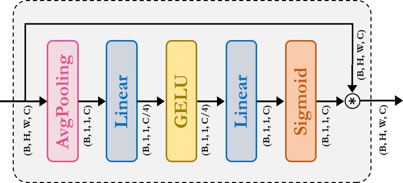 SqueezeAndExcitation: 挤压激励 (SE) 又名瓶颈模块作用 SD 频道种类 注意。它由 AvgPooling、Dense/FullyConnected (FC)/Linear、GELU 和 Sigmoid 模块组成。