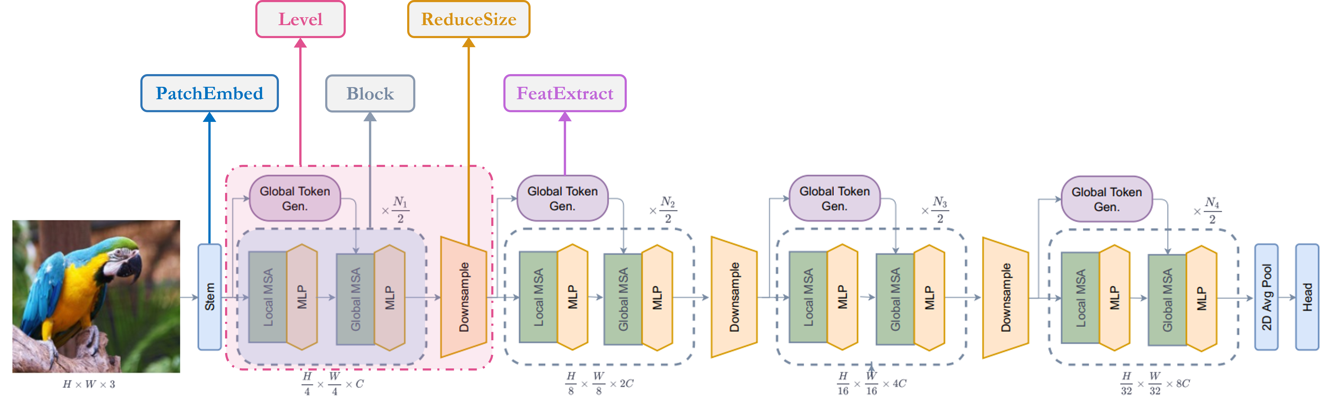 让我们快速了解一下我们的关键组件, 1. Stem/patchify 层在网络开始时处理图像。 对于这个网络,它会创建 patchs/tokens 并将它们转换为 embeddings。 2. 它是使用不同的 块。 3. 它使用 Depthwise-CNN、SqueezeAndExcitation (Squeeze-Excitation)、CNN 和 MaxPooling 生成全局令牌/补丁。所以基本上 它是一个特征提取器。 4. 它是重复模块,它关注功能和 将它们投影到某个维度。 1. 本地多头自我注意。 2. 全局多头自我注意。 3. 将向量投影到另一个维度的线性层。 5. 它与 Global Token Gen. 模块非常相似,只是它 使用 CNN 而不是 MaxPooling 对额外的 Layer 进行下采样 规范化模块。 6. 是负责分类任务的模块。 1. 它将特征转换为特征。 2. 它处理功能以决定 class。Stem/PatchEmbed:Level:Global Token Gen./FeatureExtraction:Block:Local-MSA:Global-MSA:MLP:Downsample/ReduceSize:Head:Pooling:N x 2DN x 1DClassifier:N x 1D