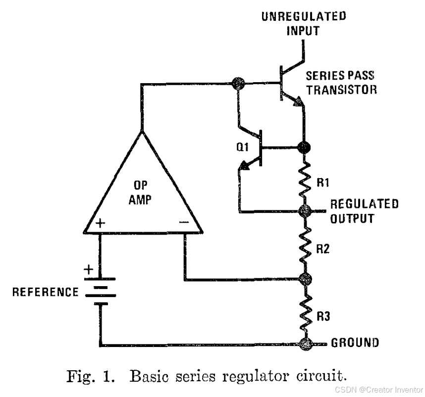 图1展示了一个典型电压调节器的简化原理图。运算放大器比较参考电压与输出电压的一部分,并控制串联通过晶体管来调节输出。通常会提供某种形式的