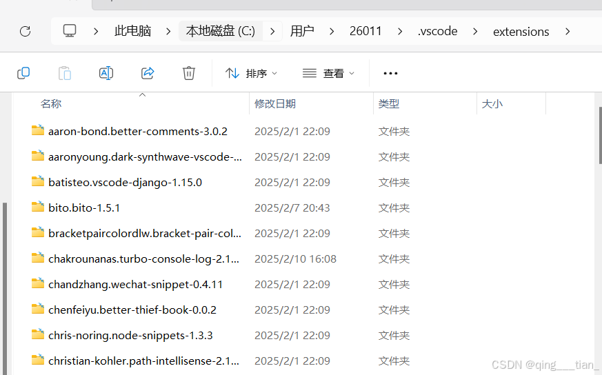 记得打开查看隐藏项目,先在有网的电脑里正常下载安装,在这里会出现对应的插件文件,作者名-插件名-版本号,复制到内网环境中的这个目录里,没有extensions文件夹的话就自己创建,最重要的一步来了